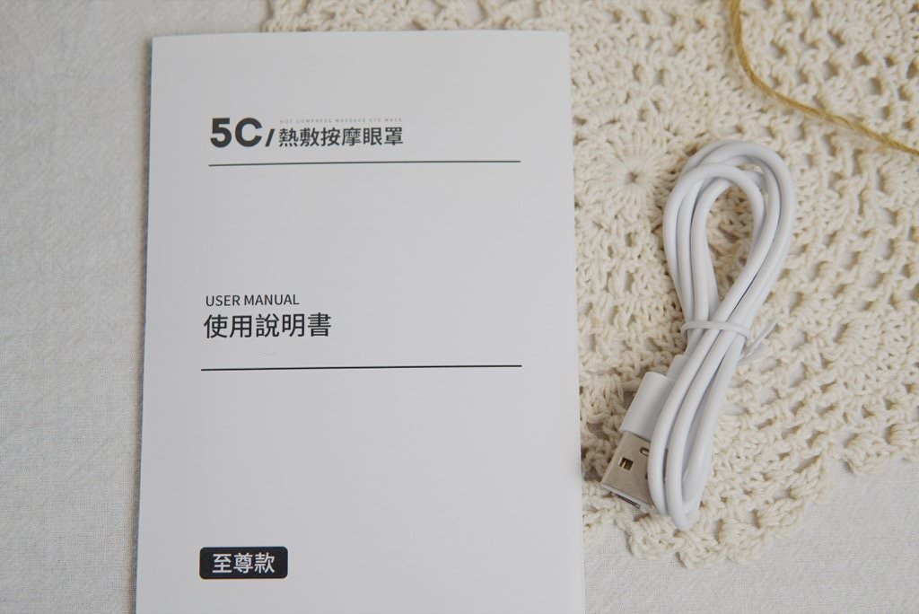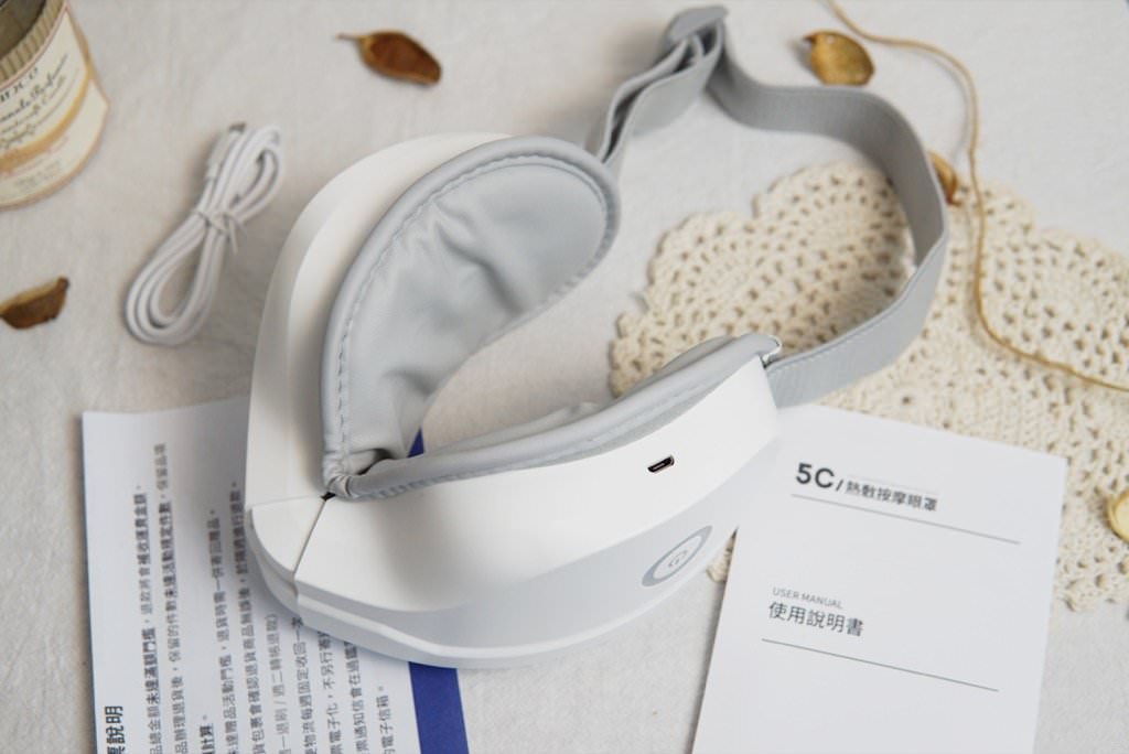 ▼開箱後,盒內有5C熱敷按摩眼罩、USB充電線、使用說明書