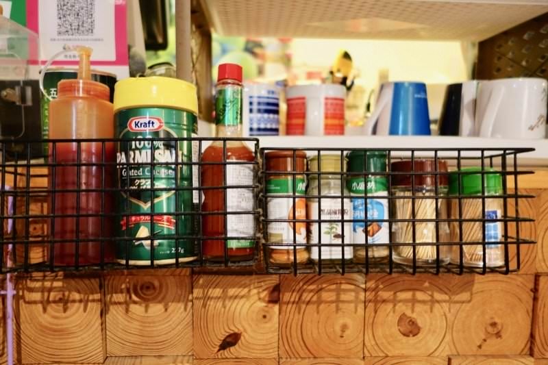 ▼義大利麵、焗烤、炸物搭配的起司粉、辣椒醬、番茄醬、胡椒粉都可以在這自取