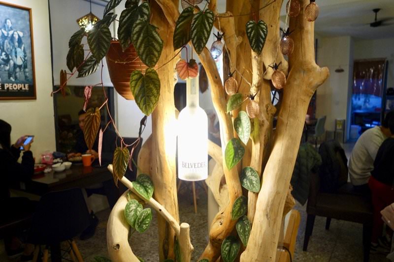 酒瓶吊燈砍在樹枝內,讓我想到之前在曼谷Chapter31餐廳也有這種樹木在屋內的設計,很喜歡這種自然悠閒的感覺。