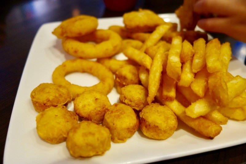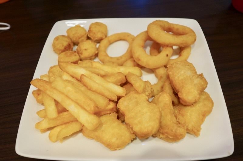 ▼炸物拼盤 $150,有薯條、洋蔥圈、雞球、雞塊,每一道很受小孩歡迎,炸得非常酥脆