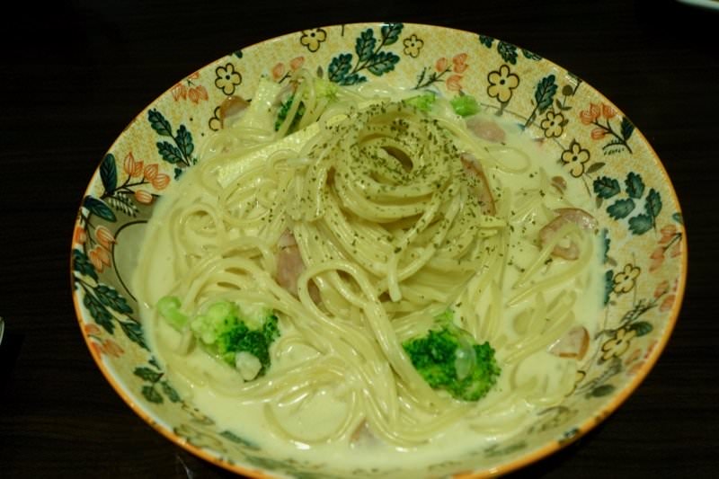 ▼白醬德式香腸麵 $150,萌達的白醬奶味十足,白醬裡頭還有燉煮入味的碎洋蔥跟蒜末,鹹度與起司香搭配起來剛剛好,很推薦他們白醬口味的麵!麵條硬度中等、有微彈口感,配菜有兩朵花椰菜,德式香腸也不錯!