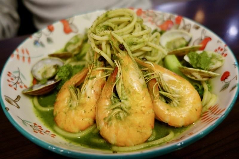 ▼青醬海鮮麵 $160,兩份海鮮都有三隻大蝦子跟一堆蛤蜊,還有玉米筍等配料,料真的配得很好,青醬感覺是手工製的,味道很清爽,比起白醬來說口味較淡一些。但是搭配起來仍然很順口!主餐的份量調配得蠻剛好的,都是一個人吃會覺得飽,大胃王可以再升級套餐!