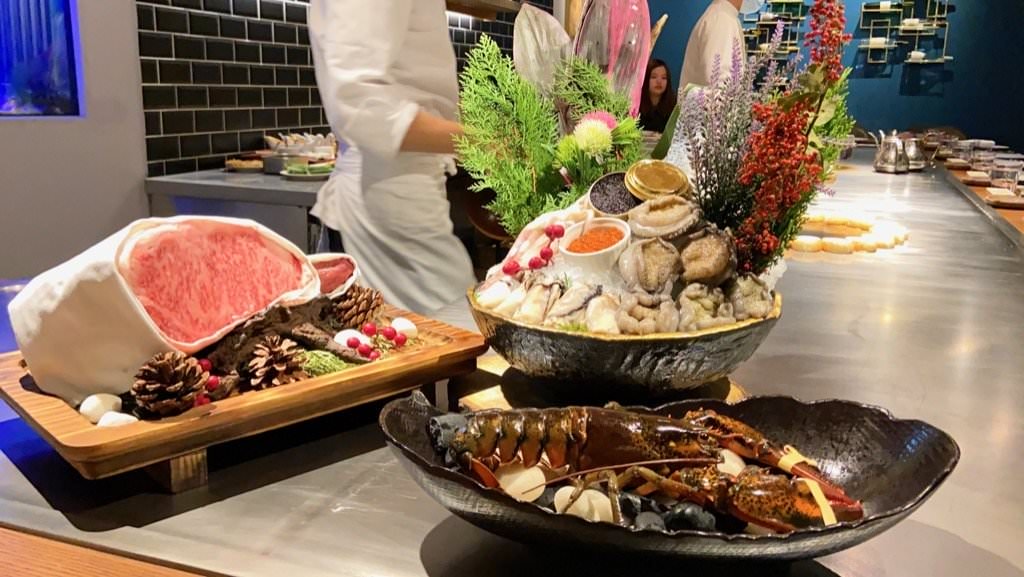 ▼ 煎台上已經準備好今天要料理的食材,食材看起來非常新鮮,師傅們的擺盤也超美!我就是被姊妹傳的這些照片燒到,特別是日本A5佐賀和牛,那個油花讓人眼睛一亮!