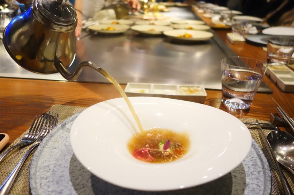 ▼ 湯品是牛肉+鵝肝慕斯,牛肉有松露香氣,湯帶有蕈菇香味,佐新鮮大黃瓜片,喝起來層次非常豐富!