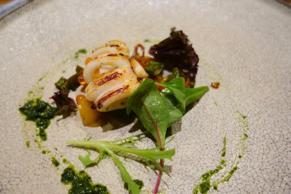 ▼ 這道算熱沙拉~羅勒青醬魷魚,魷魚新鮮不在話下~新鮮蔬菜與羅勒醬味道也極佳。