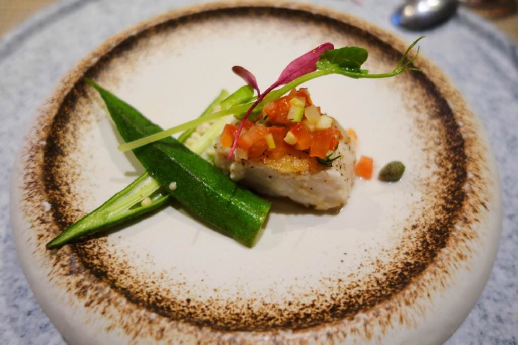 ▼ 午仔魚佐酸豆莎莎醬以及水耕生菜,加上新鮮秋葵~午仔魚本身的肉質就很好,加上莎莎醬以及些許檸檬汁,非常好吃。