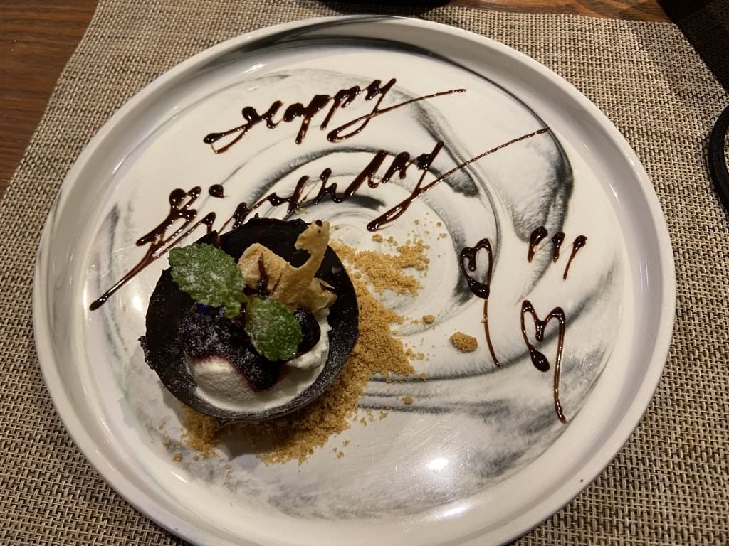 ▼ 訂位的時候忘了說有壽星,現場臨時問服務人員,大廚很貼心的說剛好有材料馬上送我們一個精緻蛋糕,如果跟我們一樣是去隱覓鐵板燒慶祝生日,訂位的時候記得先備註喔!