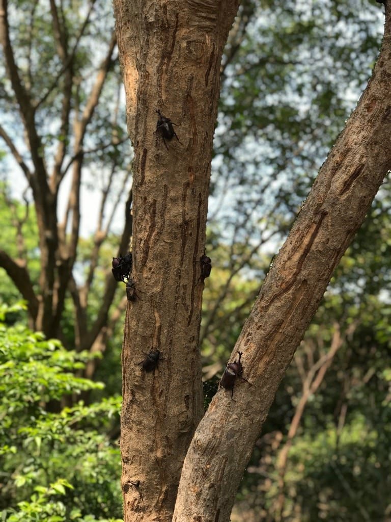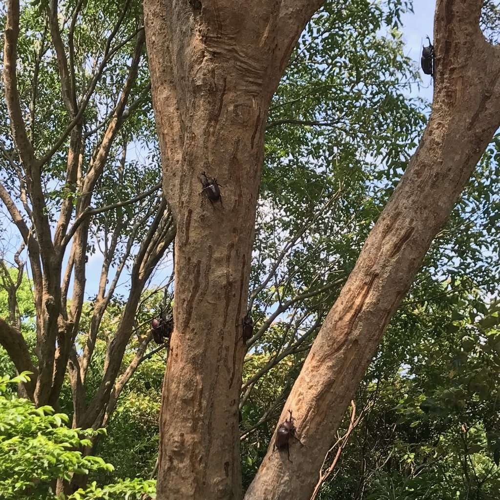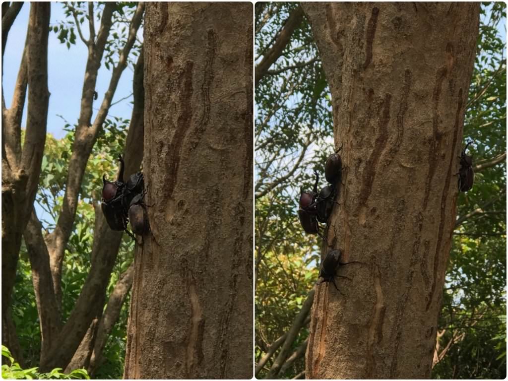 樹上的獨角仙們不時上演著角力擂台、搶親擂台,或是悠哉地吸著樹汁
