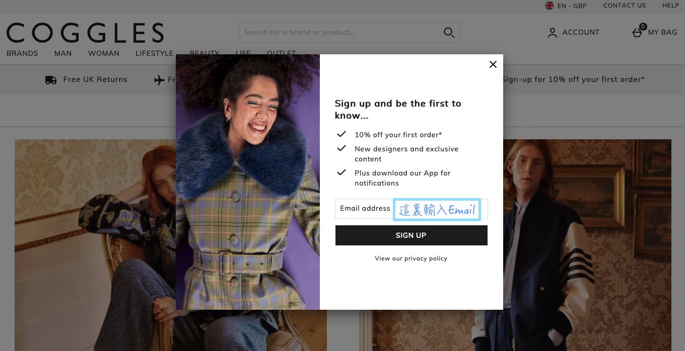 ▼打開官網會跳出下圖視窗,在框框處輸入email,信箱裡會收到最新首購優惠碼!