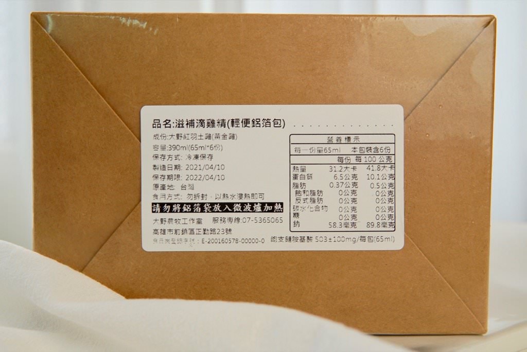 ▼大野山雞的品牌外箱非常厚實,收到宅配的時候外包裝超完整。上網一查發現他們除了滴雞精之外,也有賣全雞、雞肉各部位、以及調配好的雞湯燉包。為了完善保護各種產品,在紙箱上的挑選也非常用心。
