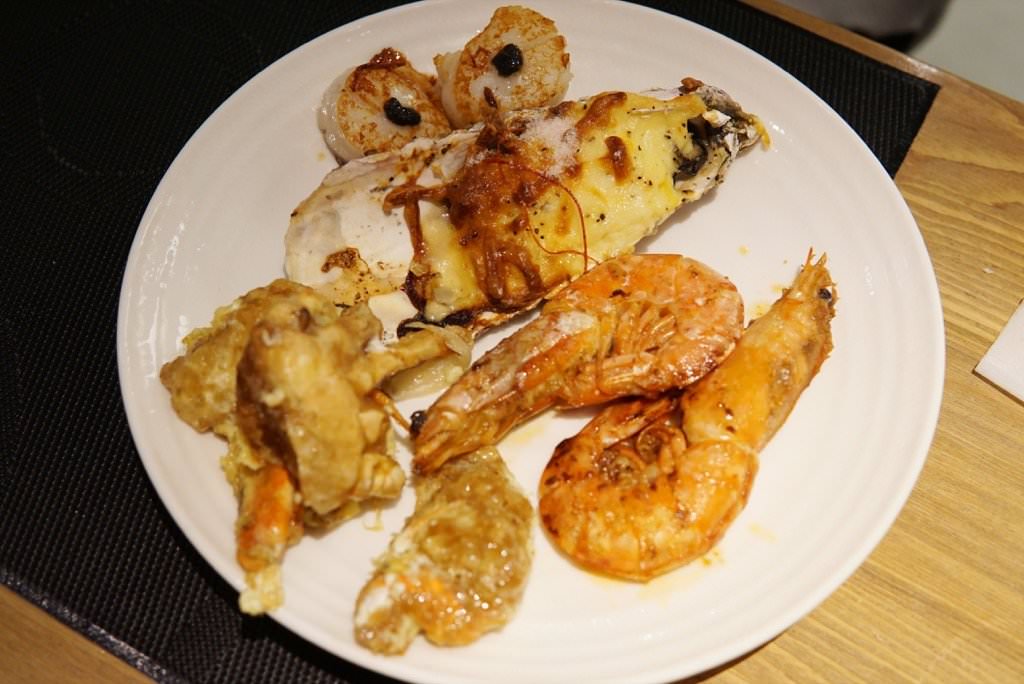 下面是Tai的第一盤,他開胃就夾了這兩盤:法式羊排、肋眼牛排、嫩煎干貝、天使紅蝦、焗烤生蠔…等,