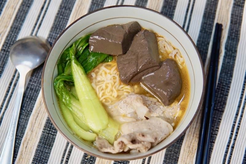 ▼搭配青江菜與五花豬肉片,超美味的麻辣鴨血泡麵就完成了!