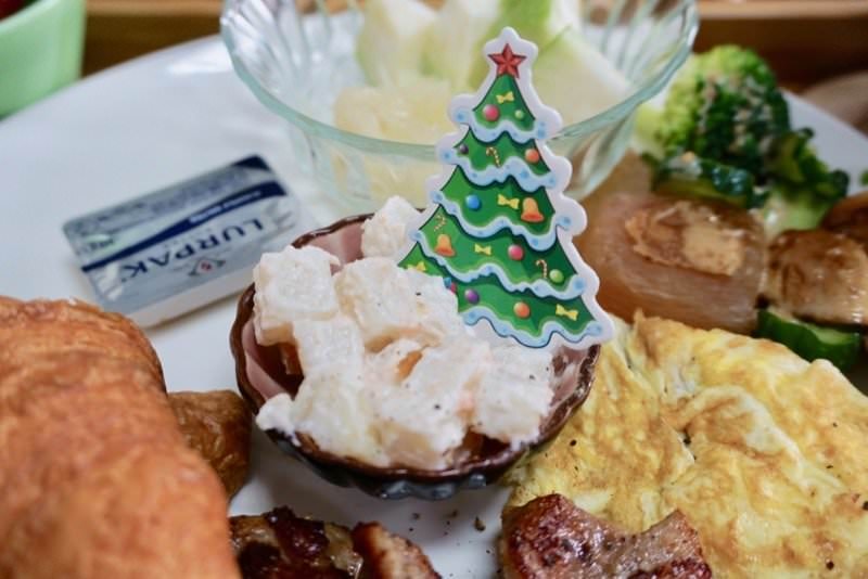 套餐(盤餐)裡頭有主餐的肉、薯條、私房菜、蛋、馬鈴薯沙拉、可頌、水果,