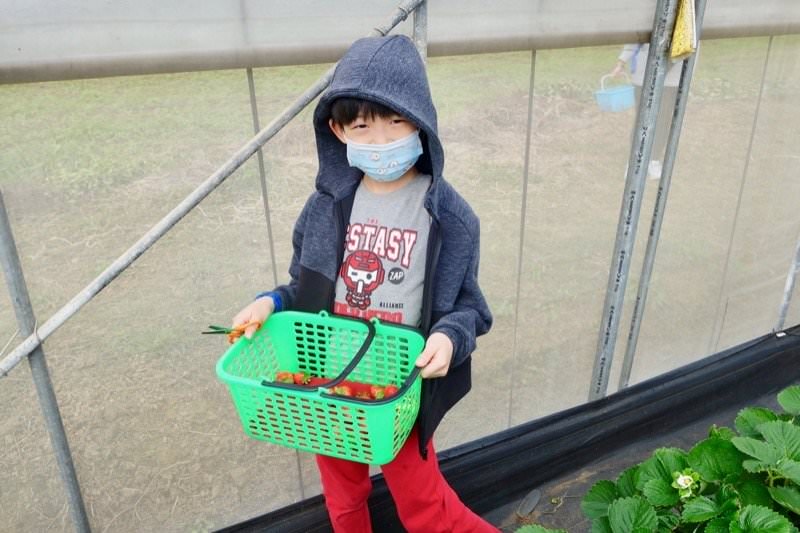 ▼Tai跟希新開幕的時候就跟著幼兒園來過,後來季節到有空就會來採草莓,我第一次來覺得這裡環境好舒適!一個溫室裡栽種四排草莓,不用曬太陽也不會太過悶熱,位置夠寬敞可以蹲下來慢慢採。