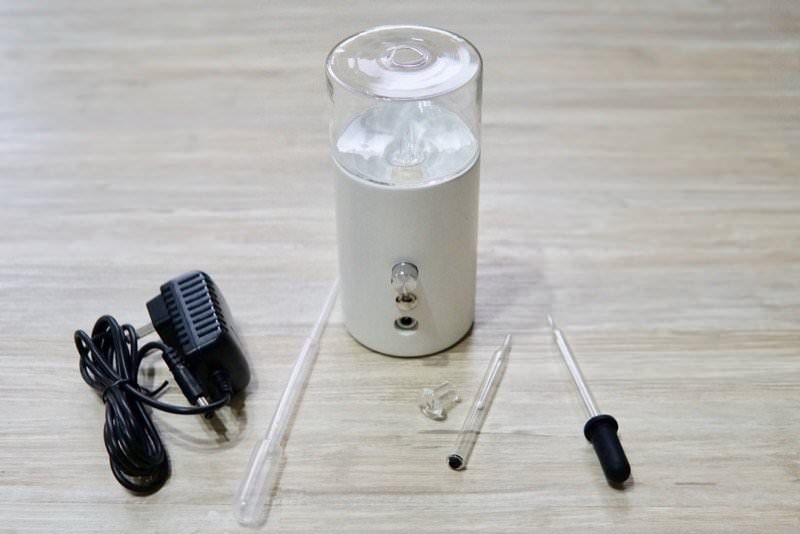 ▼【覺醒】精油擴香儀 全部零件如下,三個長管子是添加精油、清潔與測試用,另外還有電源線與集油瓶蓋