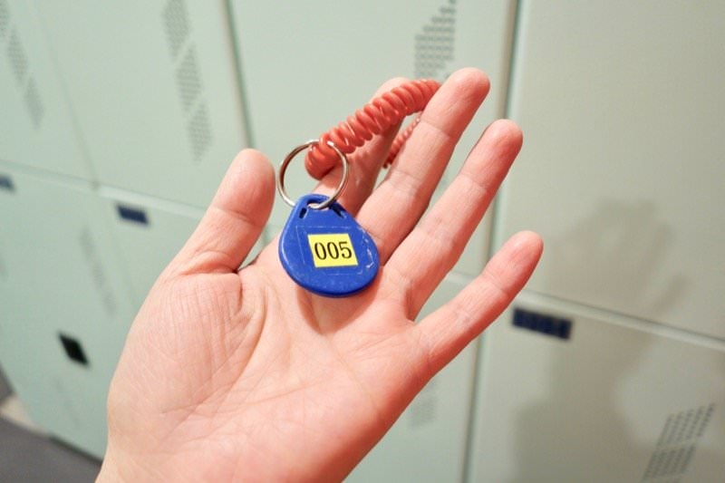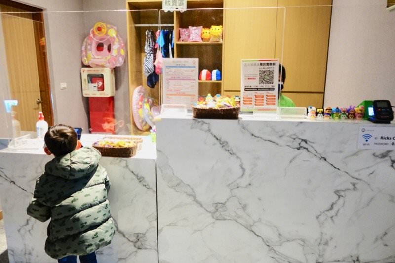 ▼進入2館1樓的溫泉區前,要先到這個櫃檯換保險箱鑰匙,去二樓遊戲室則是換卡,隨時都會有服務人員幫忙,如果沒帶小朋友的泳衣或泳具也可以現場買喔。