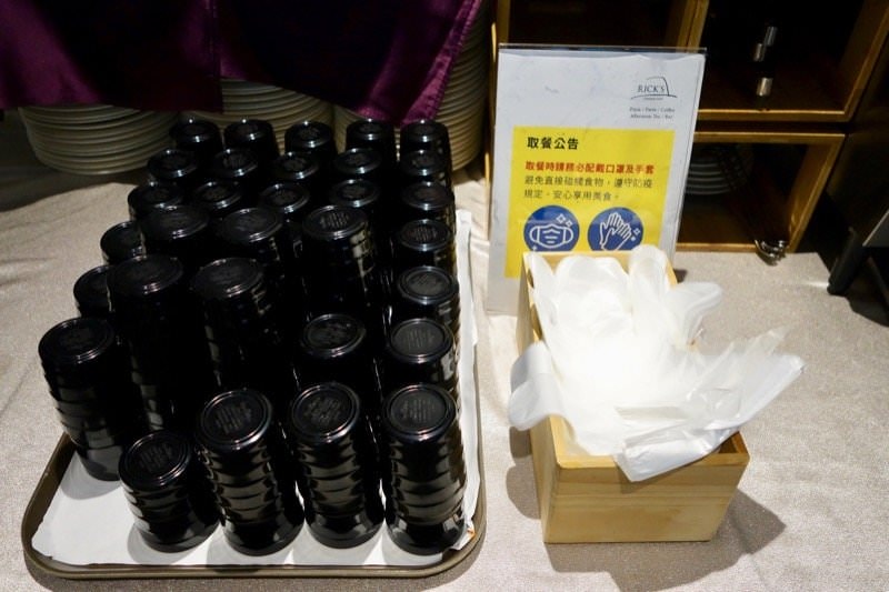 ▼防疫期間取餐一定要戴口罩,飯店提供一次性免洗手套,每次取餐使用保護自己也保護他人