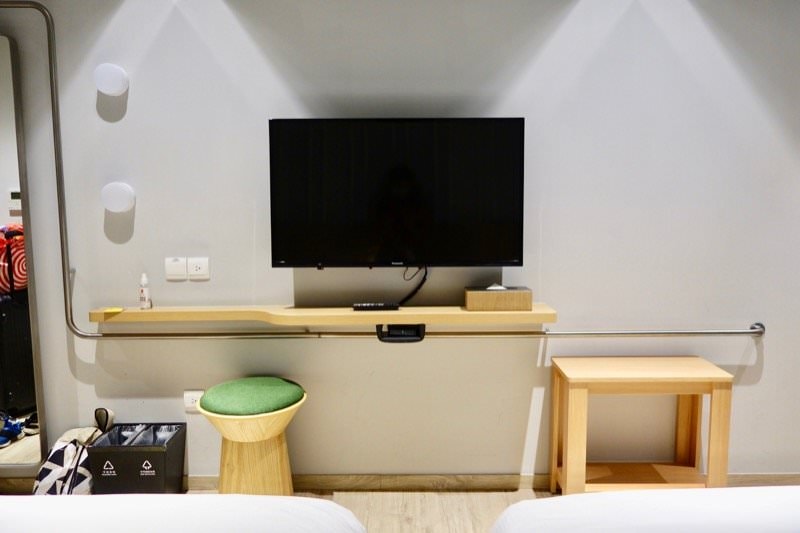 比較可惜的是只有一張椅子跟小桌子還有電視櫃下方窄檯面,買外帶回飯店吃都放桌上比較擠,女生化妝的物品要擺床頭櫃或是泡湯的浴室。