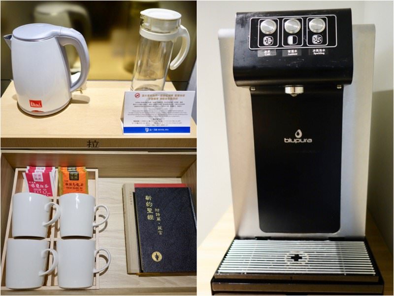 ▼品文旅房內不提供寶特瓶水,但有提供瓶子可到房外裝氣泡水或是一般水,也有熱水壺與茶包