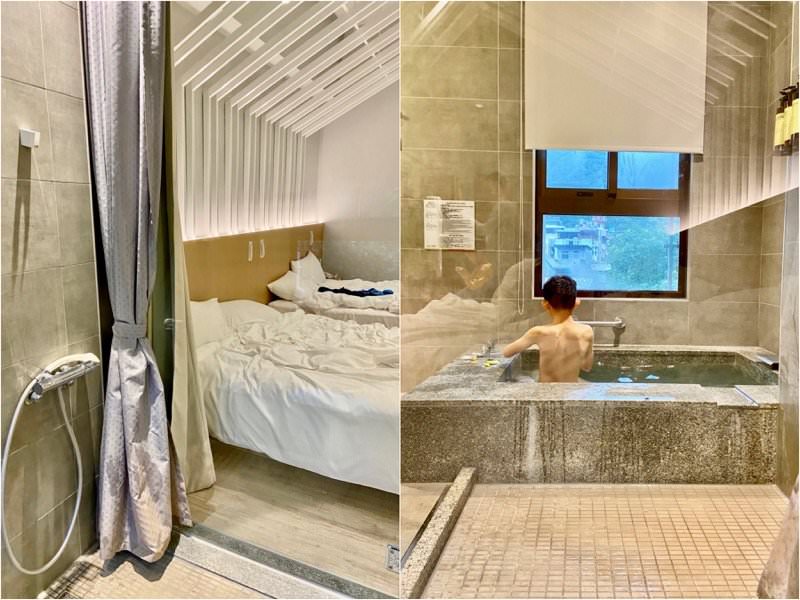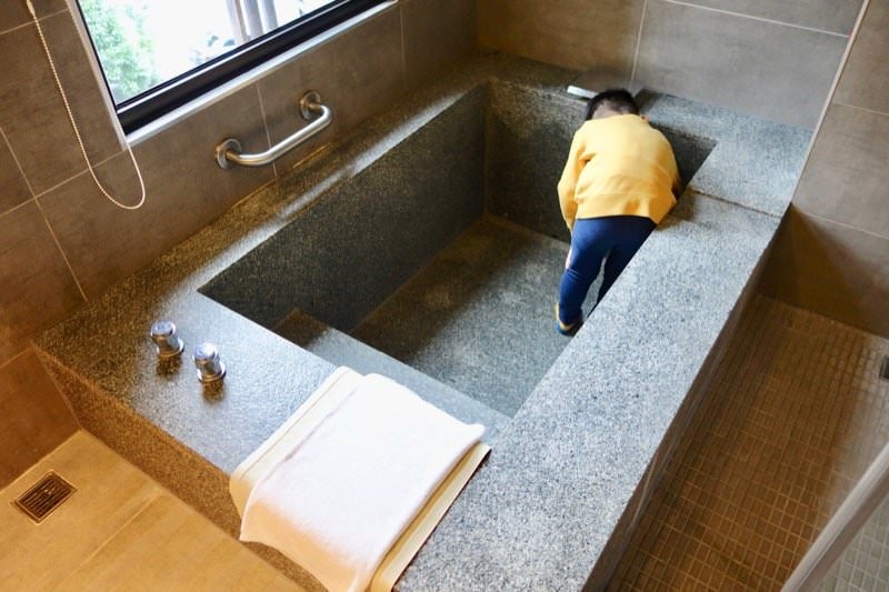 ▼品文旅的房內泡湯池是洗澡泡湯一個地方,廁所一個地方,這樣分開也蠻好的!沖完澡直接走進去泡,水壓水溫都足夠,泡湯池內外都可拉簾,小孩在泡的時候把簾子拉開可隨時注意安全。