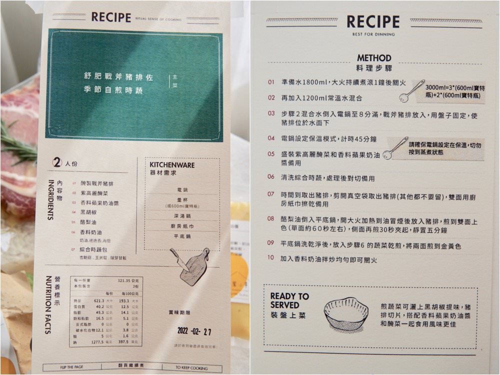 每個新鮮料理包中都包含餐點所有食材與詳細的食譜。