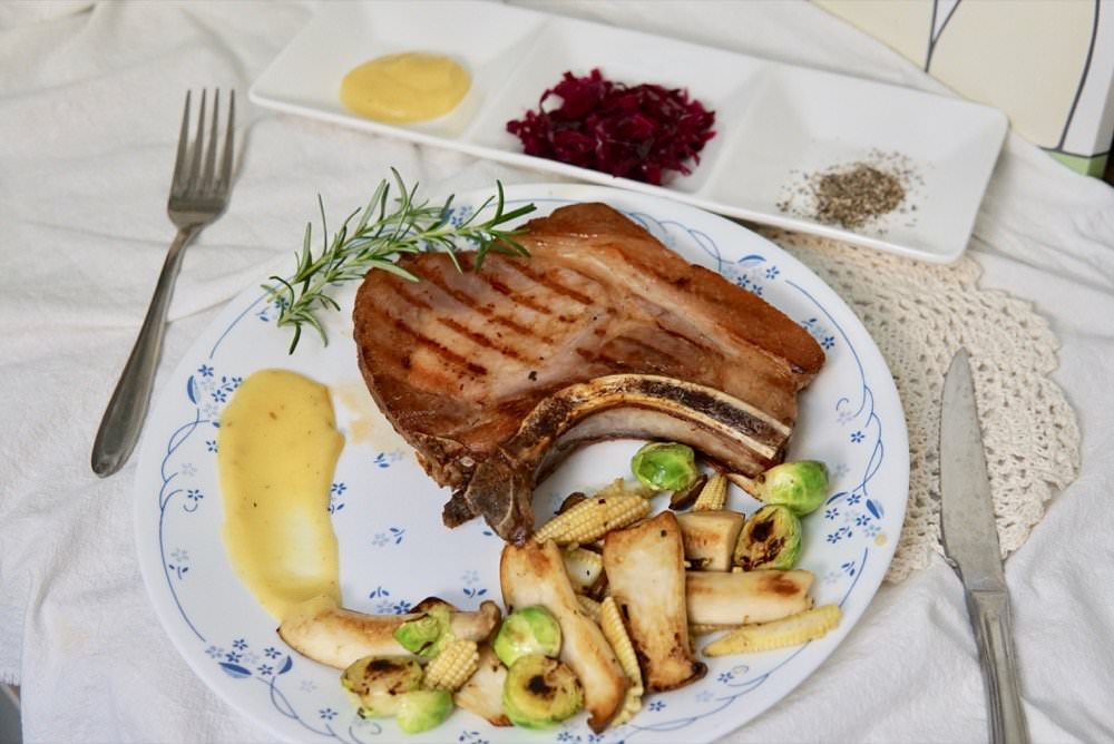 搭配醃過煎的恰恰的戰斧豬排,多了一股清爽感,