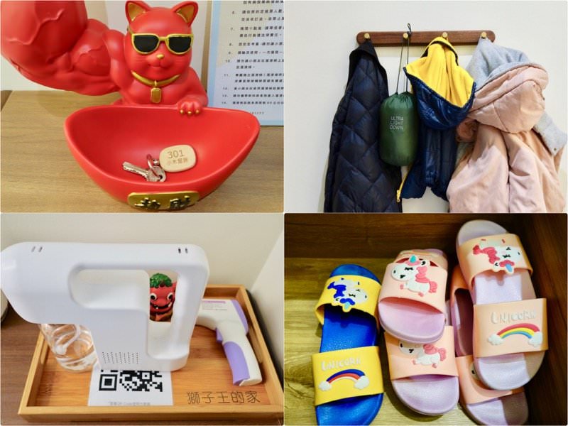 ▼一進門就像回到家一樣,玄關櫃上有放鑰匙的猛男招財貓、門後方有掛外套的地方,還有酒精紫外線消毒、溫度計,最棒的是各種尺寸的兒童與大人拖鞋都有備齊,民宿是今年新開幕,所有東西都很新很乾淨。