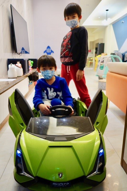 ▼這台掀車門的車適合5y跟7y的兩兒,當天有點沒電動得比較慢,但兩隻還是超愛!一直輪流開😂