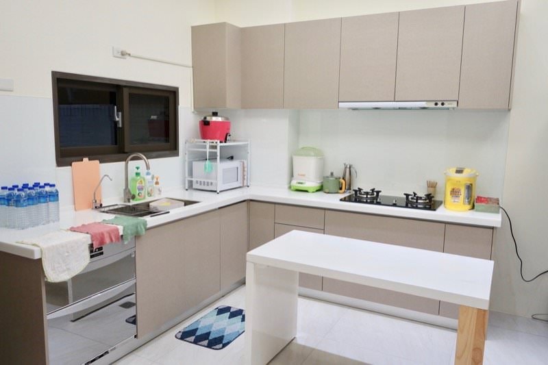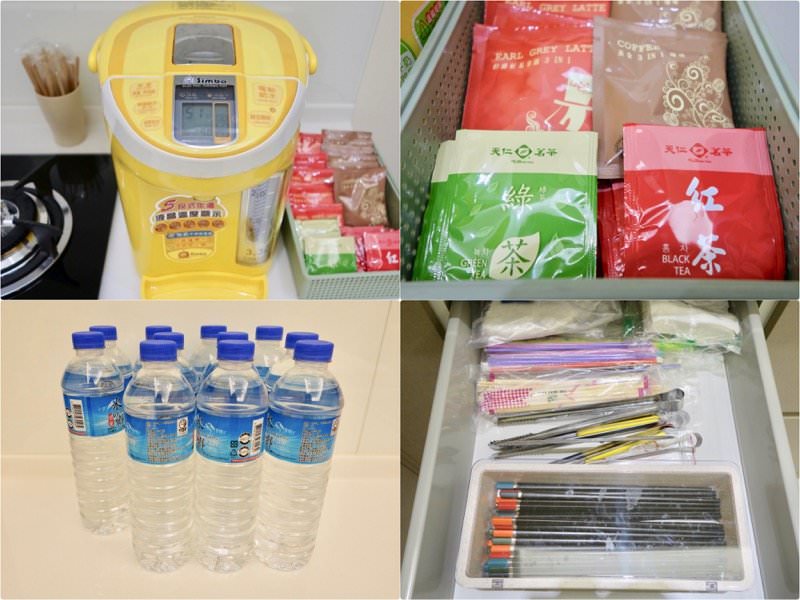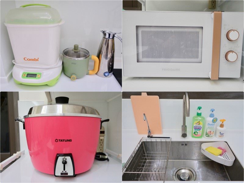 ▼廚房設備齊全,有奶瓶消毒鍋、熱水壺、茶包、紅茶拿鐵與咖啡即溶包,礦泉水、富及第微波爐、大同電鍋、熱牛奶壺、保溫壺、奶瓶蔬果洗潔精…等