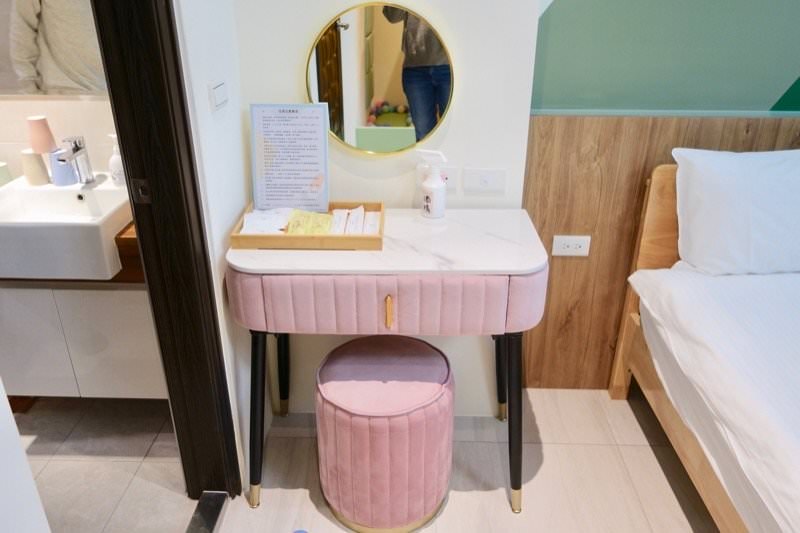 床旁邊有化妝桌,大小適合媽媽一個人用剛剛好!