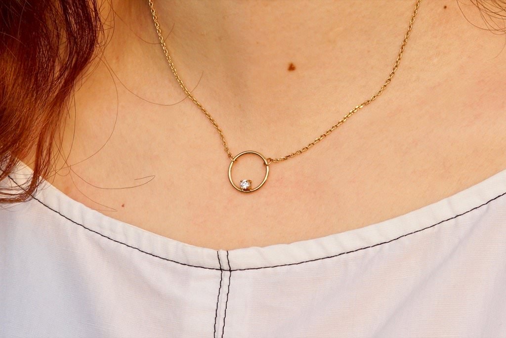 ▼金色宇宙項鍊是很標準的18K金色調,太陽照耀下閃耀著金黃色澤,搭配亮度絕佳的方晶鋯石,飾品整體的細緻度完全跳脫出來!