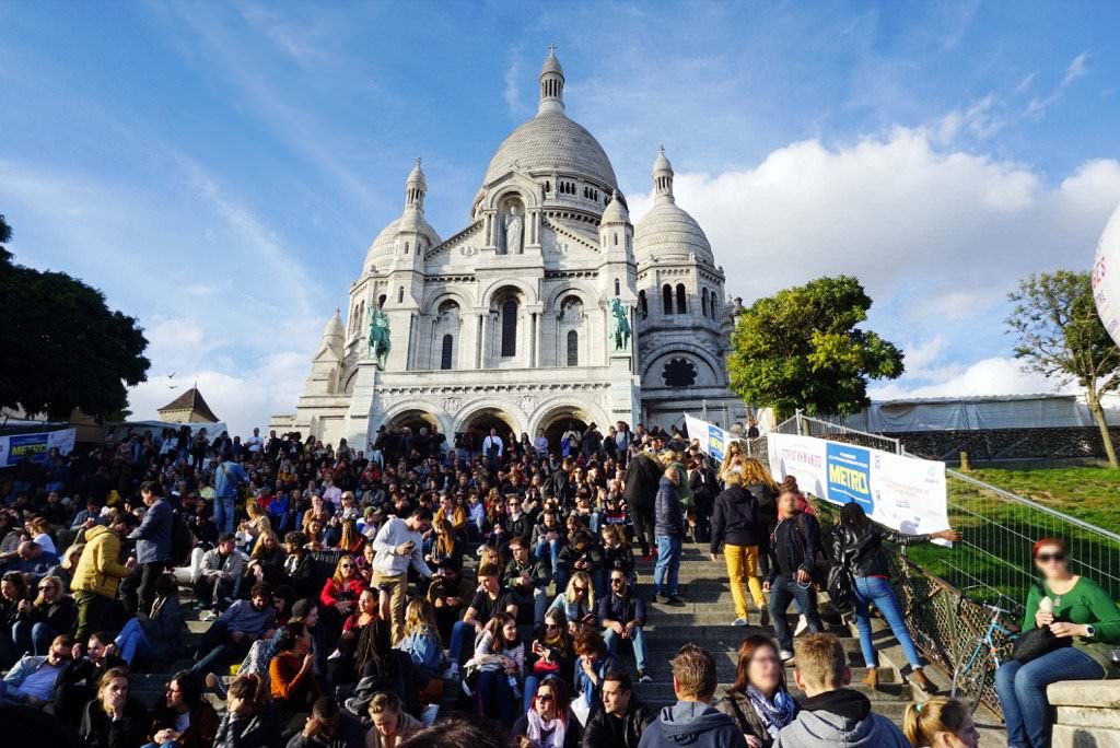 這天巴黎聖心堂前的階梯人山人海,許多外國人人手一杯酒精飲料,還有許多活動攤位,仔細一瞧原來是有活動來著~