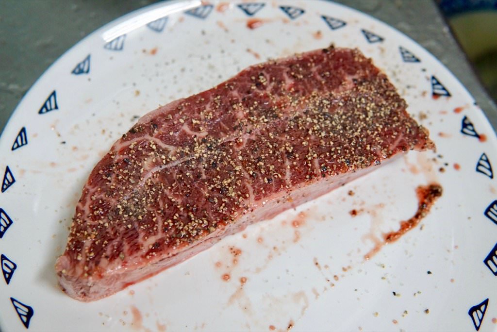 ▼出爐後將牛排放到溫瓷盤上一會兒,讓肉汁均勻分布,就是美味又肉汁飽滿的厚切PRIME霜降嫩肩❤