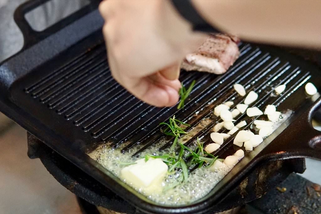 ▼接著將牛排放上熱好的鑄鐵煎鍋,大火一面煎一分鐘,角落同時撒下迷迭香、蒜片、奶油,攪拌成醬汁
