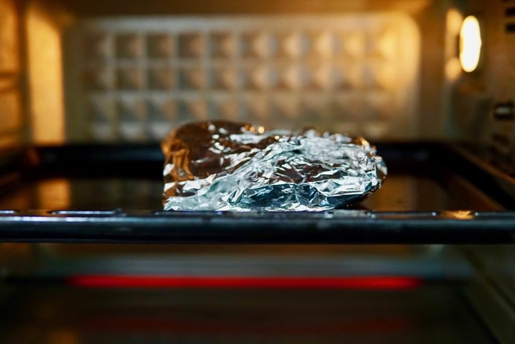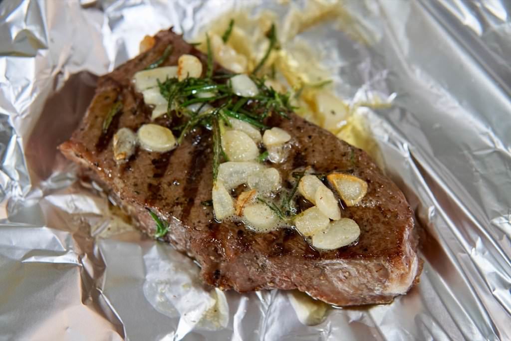 ▼在煎好的厚切PRIME霜降嫩肩上頭淋上奶油迷迭蒜香醬汁,放進鋁箔紙上包好,送進已預熱230~250度的烤箱,烤約5~10分鐘