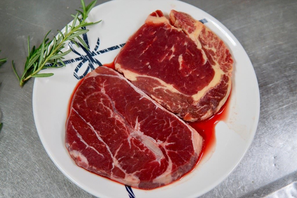 ▼團購中還有濕式熟成霜降嫩肩牛排2片+濕式熟成COW等級肋眼牛排2片,退冰後一樣鮮紅、肉質有彈性