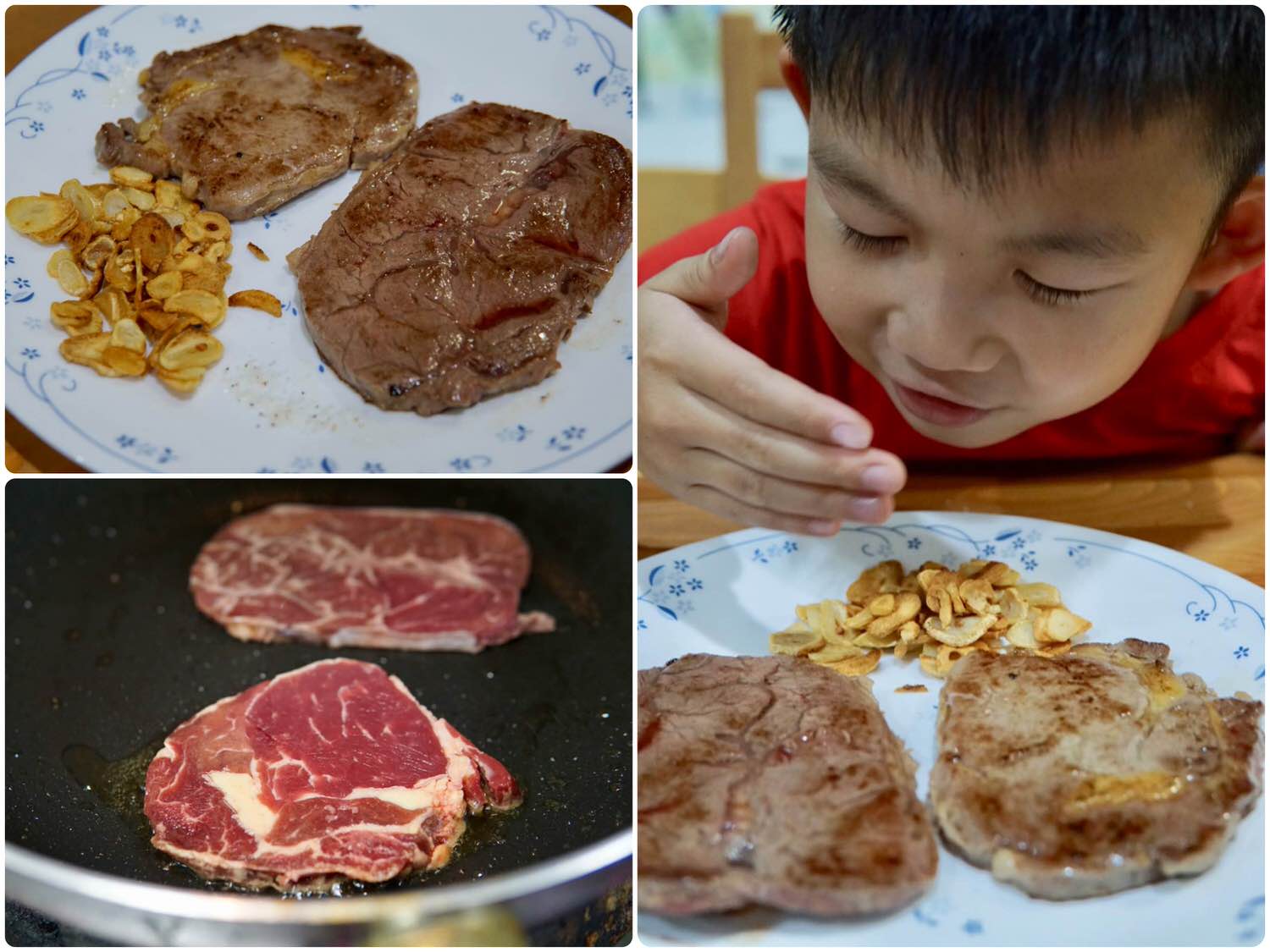 ▼如果家裡沒有牛排煎鍋也沒關係,我們也有用平底不沾鍋煎,熟度拿捏好煎起來一樣美味嫩Q!搭配酥炸特製的香蒜瓦片,在家也可以享受餐廳美味!