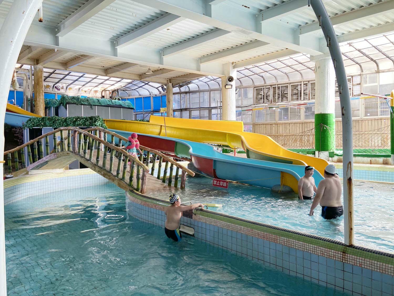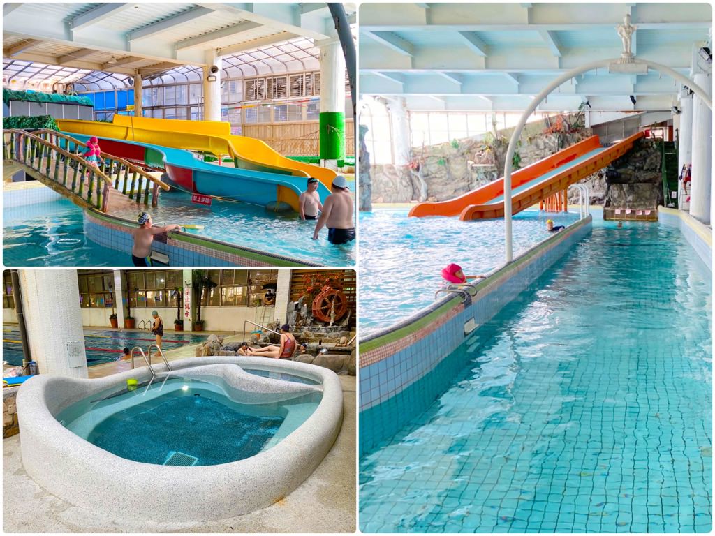 有漂漂河、滑水道、人造浪、冷/熱泡湯池、SPA池、兒童池、50m長泳池,