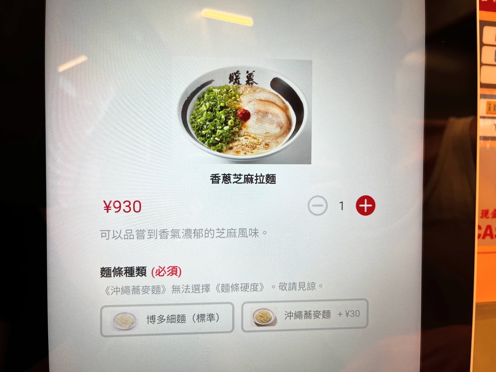 暖暮拉麵的麵條有兩種選擇 : 博多細麵或是沖繩蕎麥麵(另加30日圓),蠻多人都選擇沖繩蕎麥麵,但我們習慣細麵