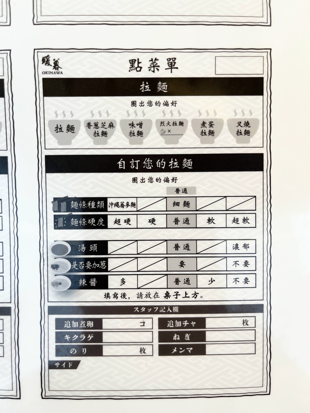 暖暮拉麵首里店 菜單與點餐方式
