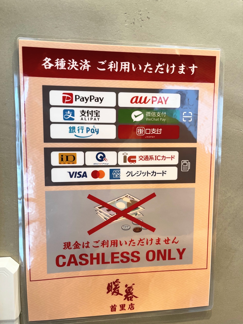 ▼暖暮拉麵首里店付款方式如下,接受信用卡、交通卡(西瓜卡或ICOCA那種)或電子支付方式,要注意“沒有”現金付款喔!!