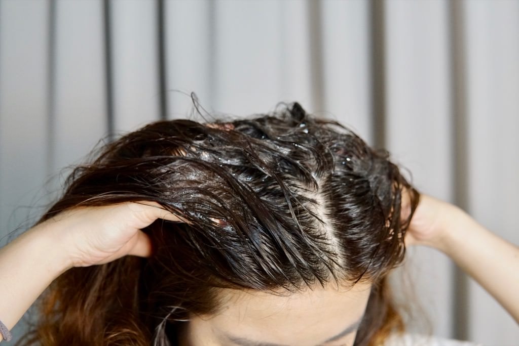 均勻塗抹之後,再以指腹輕輕按摩頭皮,