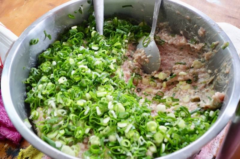 ▼新鮮的蔥花與調味好的豬絞肉餡料就在旁邊,就像中壢曾記水煎包一樣,現做現煎是他們的特色!