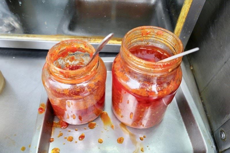 他們的辣椒是帶鹹味的辣椒醬,不會太辣,可以自己裝回去沾著吃