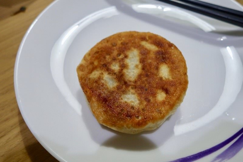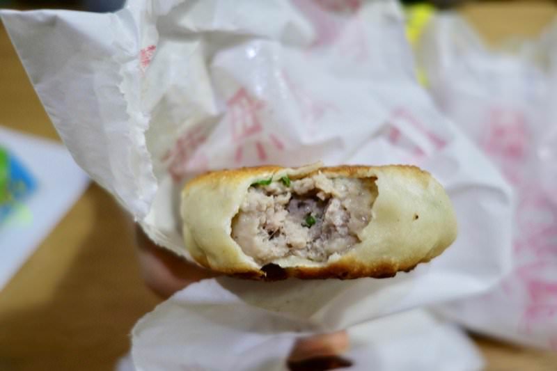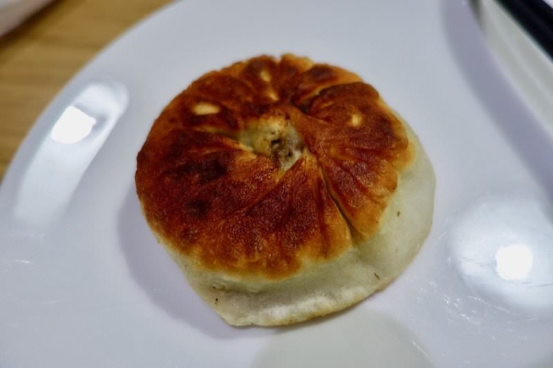 下圖是牛肉餡餅,當天買一個牛肉餡餅 + 一個豬肉餡餅,袋子上寫餡餅的是牛肉口味,沒寫的就是豬肉餡餅。他們家的餡餅皮煎的酥酥香香的又帶點嚼勁很好吃!