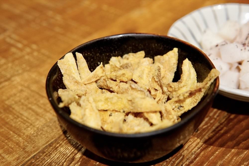 炸牛蒡是裹上特調粉下油鍋炸,吃起來有淡淡甘甜味,特別又好吃的口感!