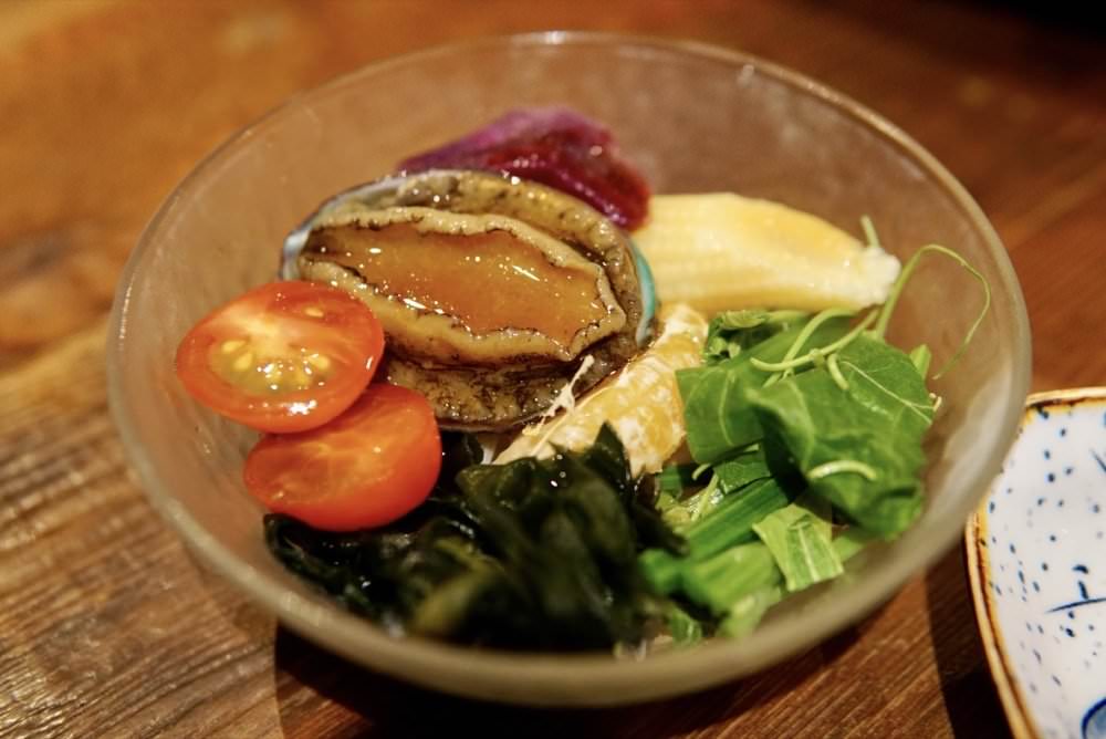 接下來上沙拉,沙拉裡頭竟然有新鮮鮑魚,口感超Q彈!