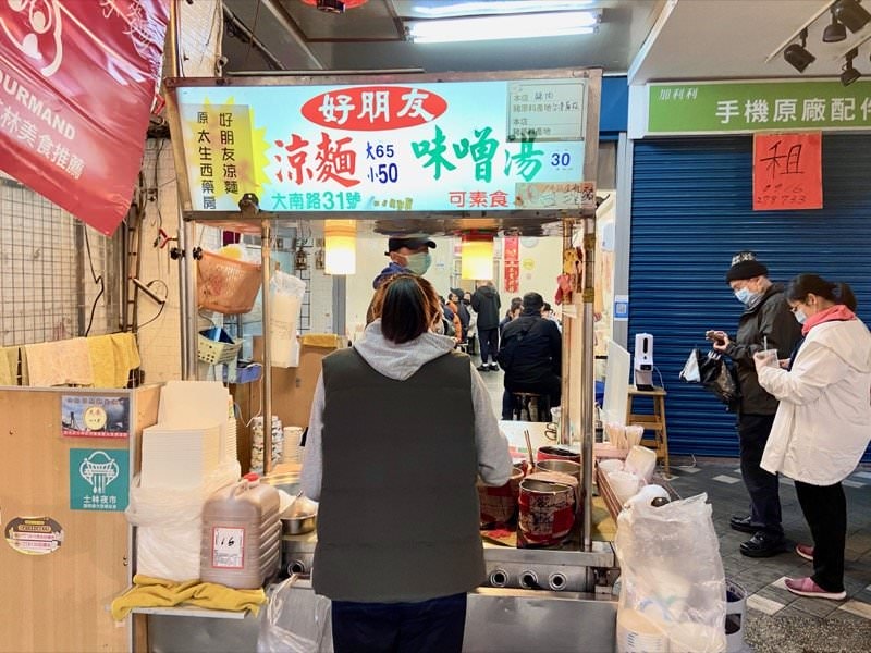 ▼好朋友涼麵位於士林夜市大南路,從夜市頭往裡走,經過士林慈諴宮沒多久就在可以在右手邊看到!每天下午4:30開始營業一直到晚上11:30