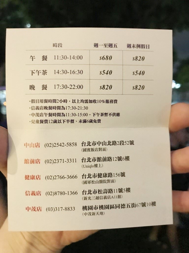 最後附上名片資訊,分別有五家分店午餐、下午茶、晚餐不同的時段與價格,