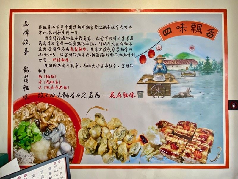 ▼ 牆上還有四味飄香的品牌故事,上頭寫著龍鬚麵線(現在大腸/蚵仔麵線)的由來,為了讓乾隆皇帝享用美食,特別將這種麵線命名龍鬚麵線,也是傳說中蚵仔麵線的由來